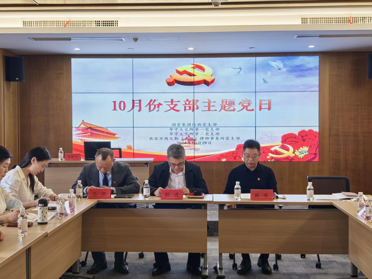 为深入贯彻党的二十届三中全会精神,进一步推动国企高质量发展,强化党建引领作用,促进企业合规管理,10月29日下午,华中文交所第一党支部、第二党支部与洪山区国资集团行政党支部、北京万商天勤(武汉)律师事务所党支部联合开展以“党建引领合规护航”为主题的支部主题党日活动,近30名党员同志到场参与。