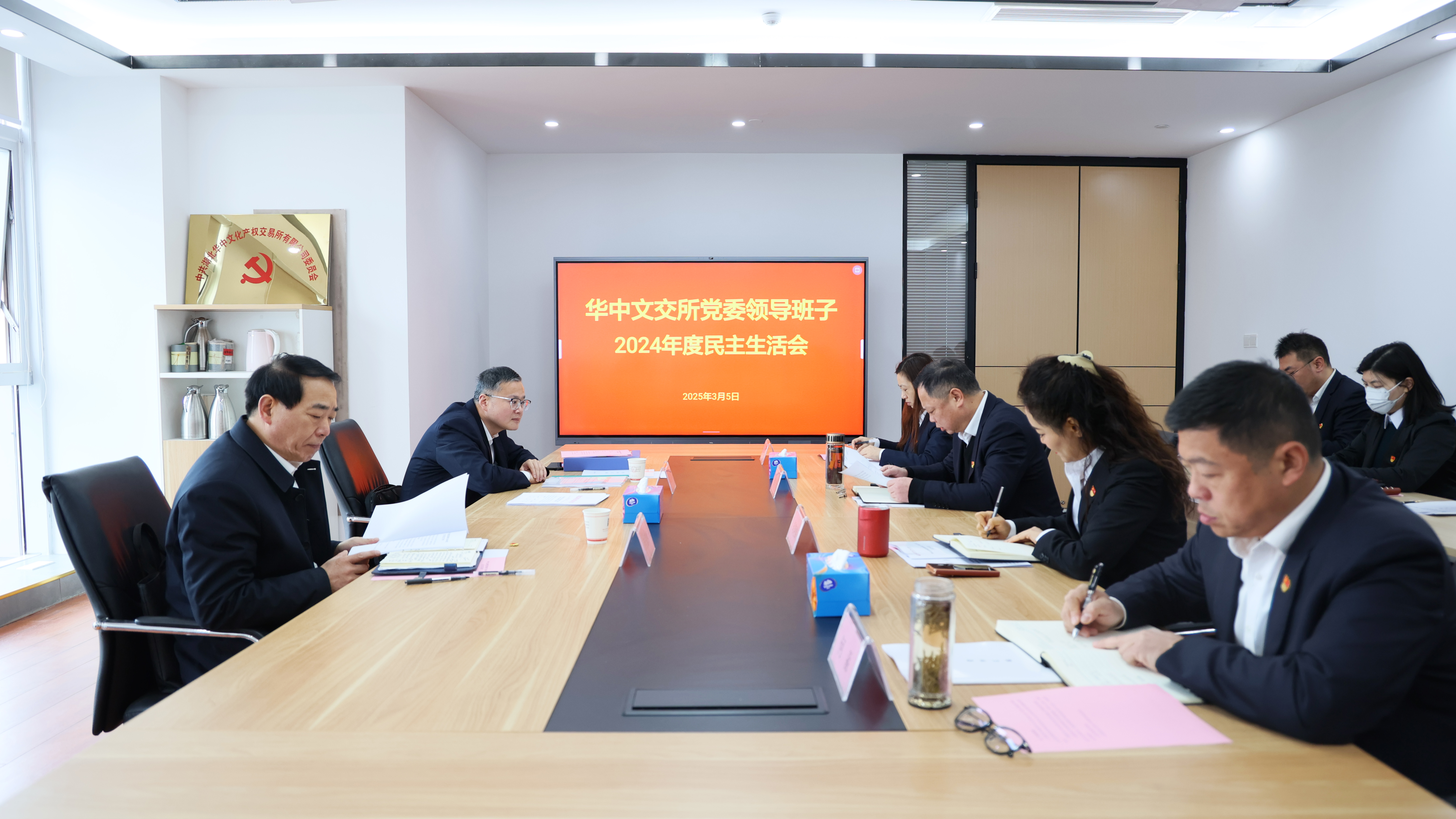 3月5日上午,华中文交所党委召开2024年度民主生活会。集团高管卢国洪、集团党委第一巡察组组长周盛到会督导,公司党委书记、董事长程锐主持会议,全体党委班子成员参会。