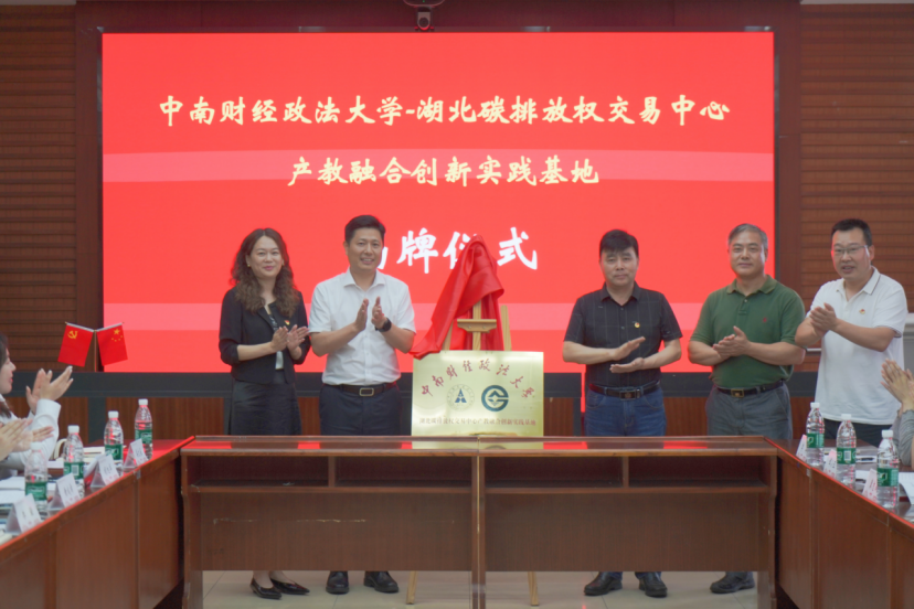 随后,湖北碳交中心党委副书记、总经理何昌福,党委委员、副总经理张雁与中南财经政法大学金融学院党委书记汪平及中南财经政法大学金融学院党委委员、副院长吕勇斌共同为“中南财经政法大学-湖北碳排放权交易中心产教融合创新实践基地”揭牌。这一基地的成立,将充分发挥中南财大在金融领域的学术优势与湖北碳交中心在碳交易市场的实践优势,促进双方围绕碳金融人才培养、课题研究、成果转化等多方面实现深度合作,为绿色金融发展注入新动能。