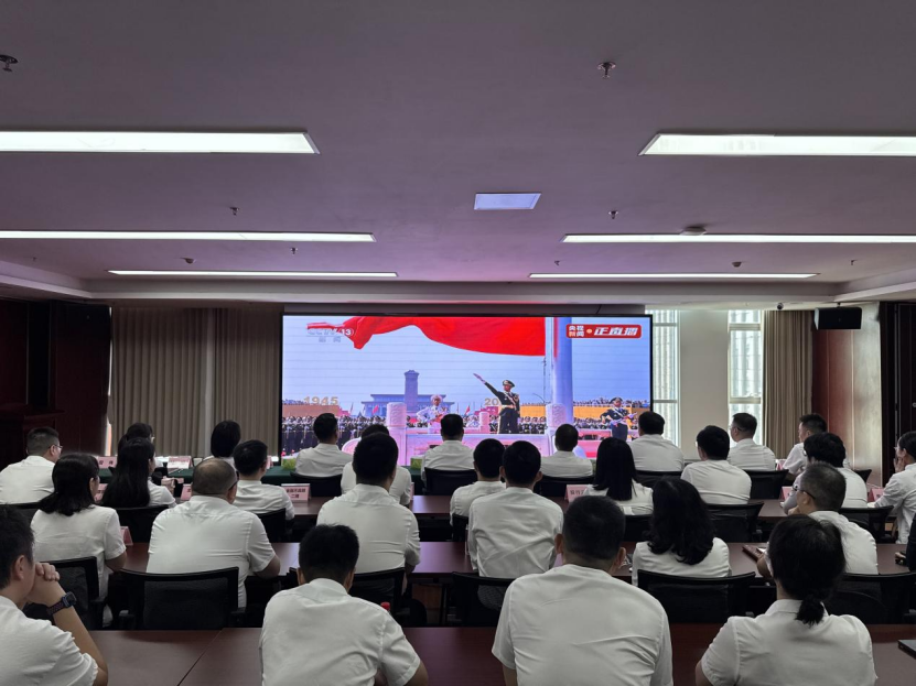 9月3日,纪念中国人民抗日战争胜利暨世界反法西斯战争胜利80周年大会在北京天安门广场隆重举行,湖北省资管公司组织全体干部员工集中收看大会直播盛况,共同铭记历史、缅怀先烈,从伟大抗战精神中汲取奋进力量。