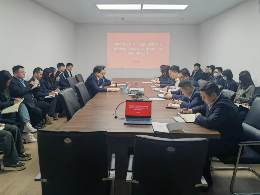 为深入学习贯彻党的二十届四中全会精神,将理论学习成果转化为推动企业高质量发展的强大动力,12月29日上午,湖北金仓党支部组织普惠小贷、湖北金仓全体干部职工,召开党的二十届四中全会精神专题宣讲会。湖北金服党委书记、董事长黄骏飞作专题宣讲,党委委员、副总经理、湖北金仓党支部书记朱格主持会议。
