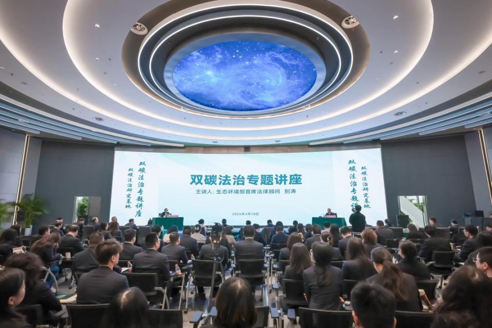 为深入贯彻学习《碳排放权交易管理暂行条例》(以下简称《条例》)重要精神,进一步凝聚司法机关、实务部门、研究智库的碳市场法治共识,3月18日,“双碳法治研究基地”在中碳登大厦举办双碳法治专题讲座。生态环境部首席法律顾问、中国法学会环境资源法研究会副会长、生态环境部法规与标准司原司长别涛应邀授课。中国法学会环境资源法研究会副会长、最高人民法院环境资源审判庭原庭长刘竹梅,湖北省高级人民法院党组成员、副院长陈旗,中南财经政法大学发展规划部部长、学科建设办公室主任高利红出席讲座,中碳登党委副书记、副董事长、总经理朱国辉主持讲座。