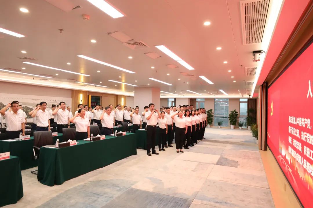 受集团党委书记、董事长曾鑫委托,集团党委副书记曾庆祝代表集团党委向集团全体党员致以节日的问候,向光荣入党的新党员表示祝贺。14名新党员及100余名老党员面向党旗进行集中宣誓。