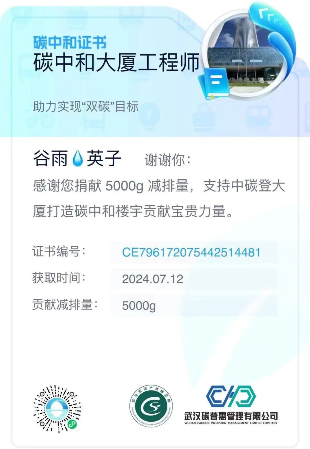 在魏英的个人碳账户中,最高峰累积了9万克的碳减排量。不断累积的碳减排量,让她有了参与低碳行动的成就感。魏英告诉湖北日报全媒记者,她曾用这些碳减排量兑换乘车优惠券或购物券,并捐献碳减排量支持中碳登大厦打造碳中和楼宇。
