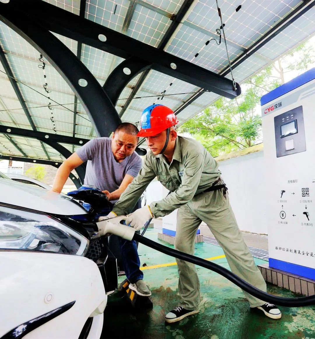 2023年9月,孝感市大悟县红畈村新能源汽车充电站,供电人员为车主讲解充电操作规程。(视界网 余健兵 摄)