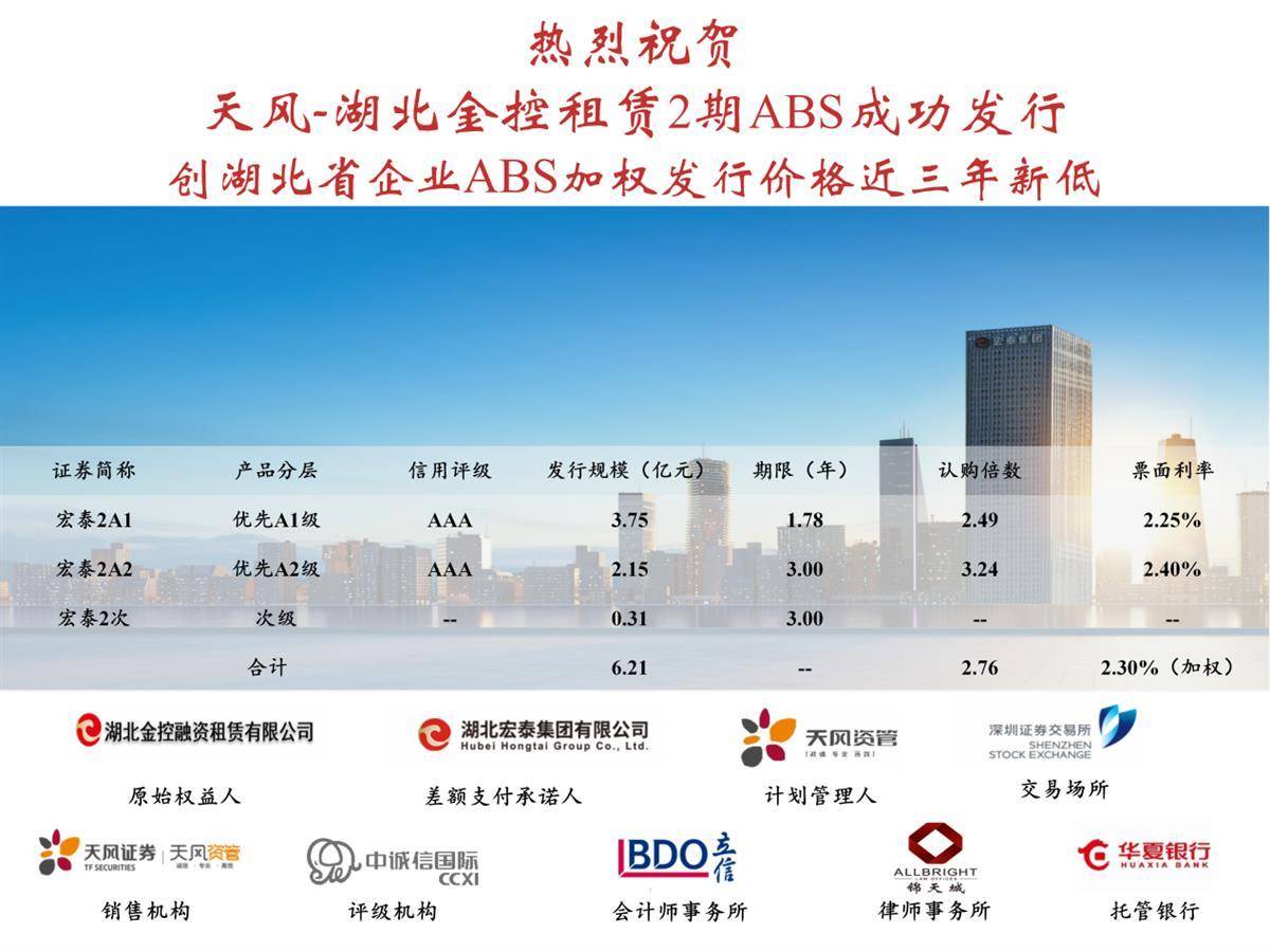 7月15日,米兰官方版网站-米兰online(中国) 所属湖北金控融资租赁有限公司(简称“宏泰融资租赁”)第二期资产支持证券(ABS)在深圳证券交易所成功发行,共募集资金6.21亿元,加权利率2.30%,创湖北企业ABS加权发行价格近3年新低。