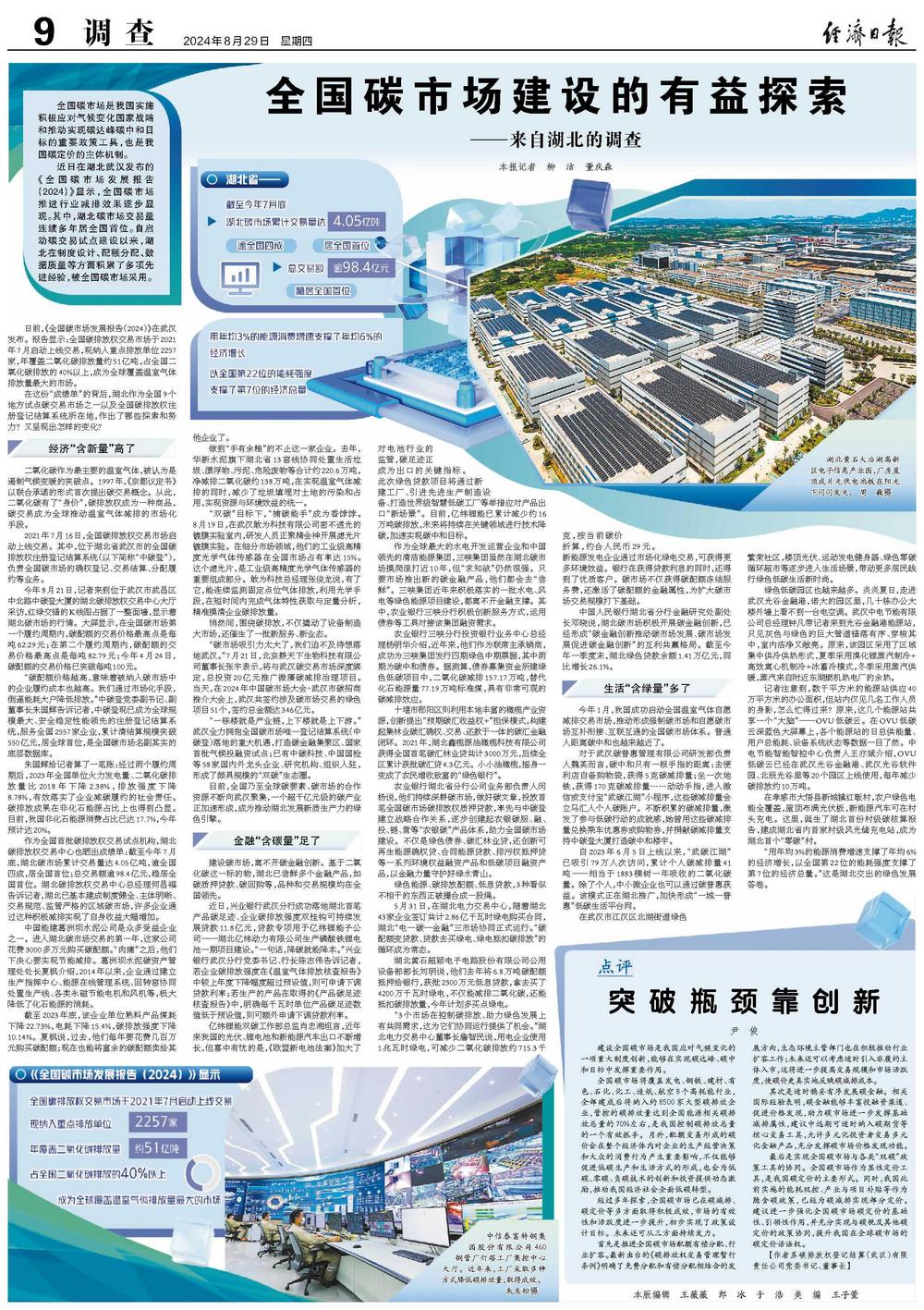 近日在湖北武汉发布的《全国碳市场发展报告(2024)》显示,全国碳市场推进行业减排效果逐步显现。其中,湖北碳市场交易量连续多年居全国首位。自启动碳交易试点建设以来,湖北在制度设计、配额分配、数据质量等方面积累了多项先进经验,被全国碳市场采用。