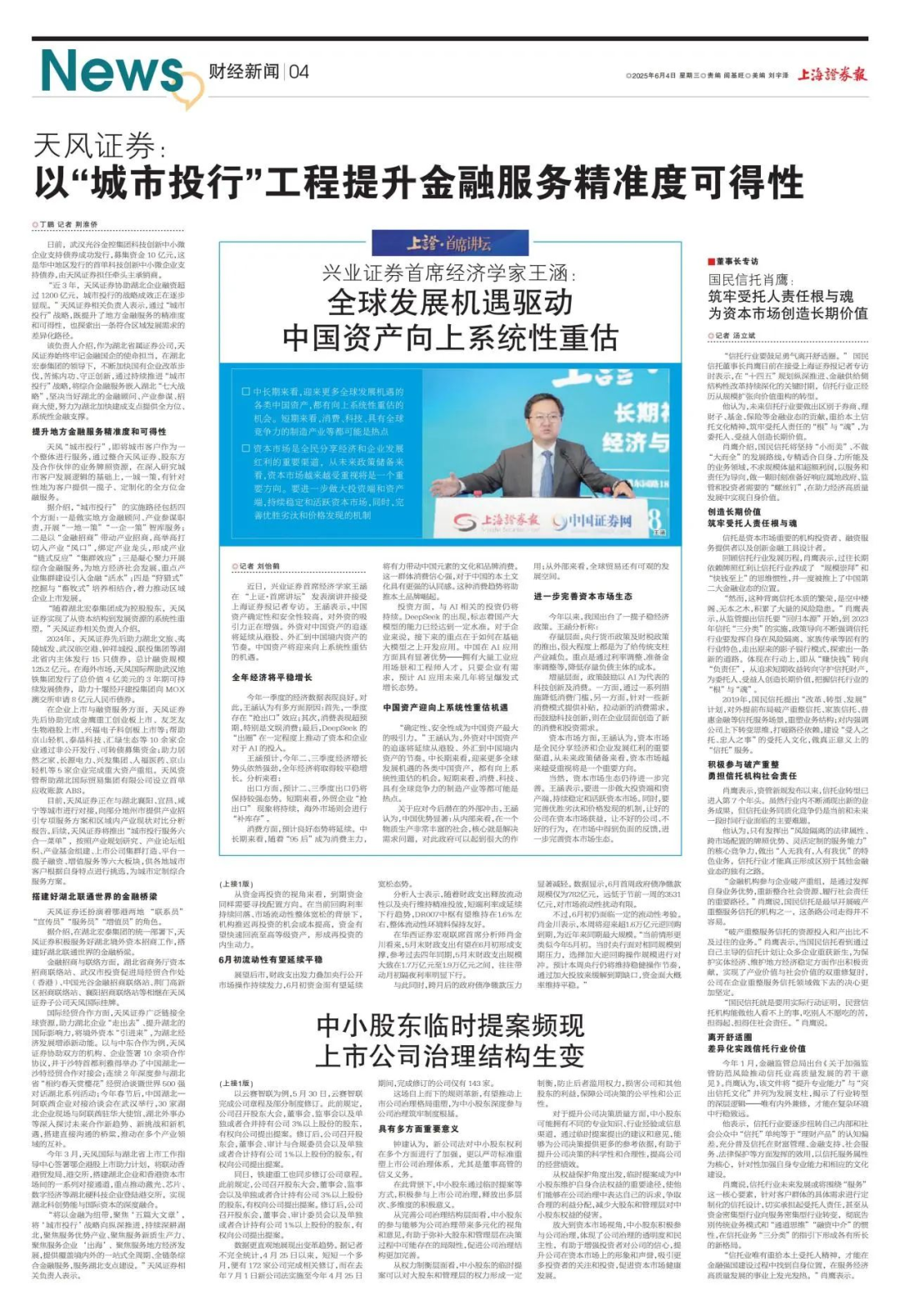 “将以金融为纽带,聚焦‘五篇大文章’,将‘城市投行’战略向纵深推进,持续深耕湖北,聚焦服务优势产业、聚焦服务新质生产力、聚焦服务企业‘出海’、聚焦服务地方经济发展,提供覆盖境内外的一站式全周期、全链条综合金融服务,服务湖北支点建设。”天风证券相关负责人表示。