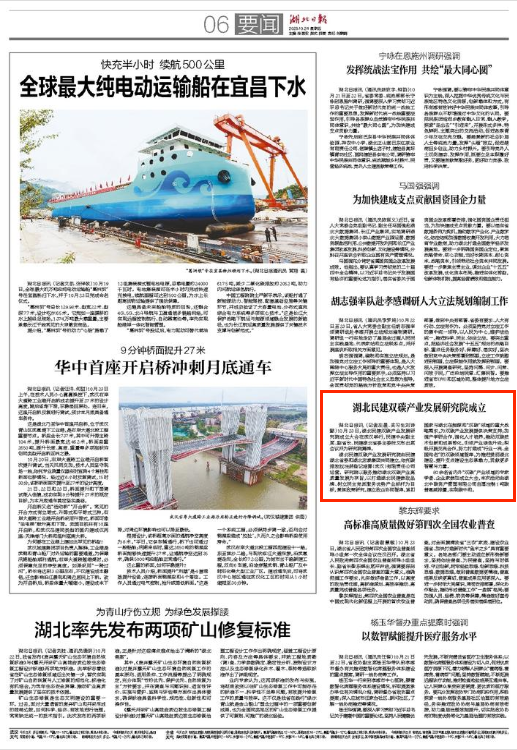 湖北日报讯 (记者左晨、实习生刘诗懿)10月23日,湖北民建双碳产业发展研究院成立大会在武汉举行,民建中央副主席、副省长、民建湖北省委主委张文彤出席会议并为研究院揭牌。