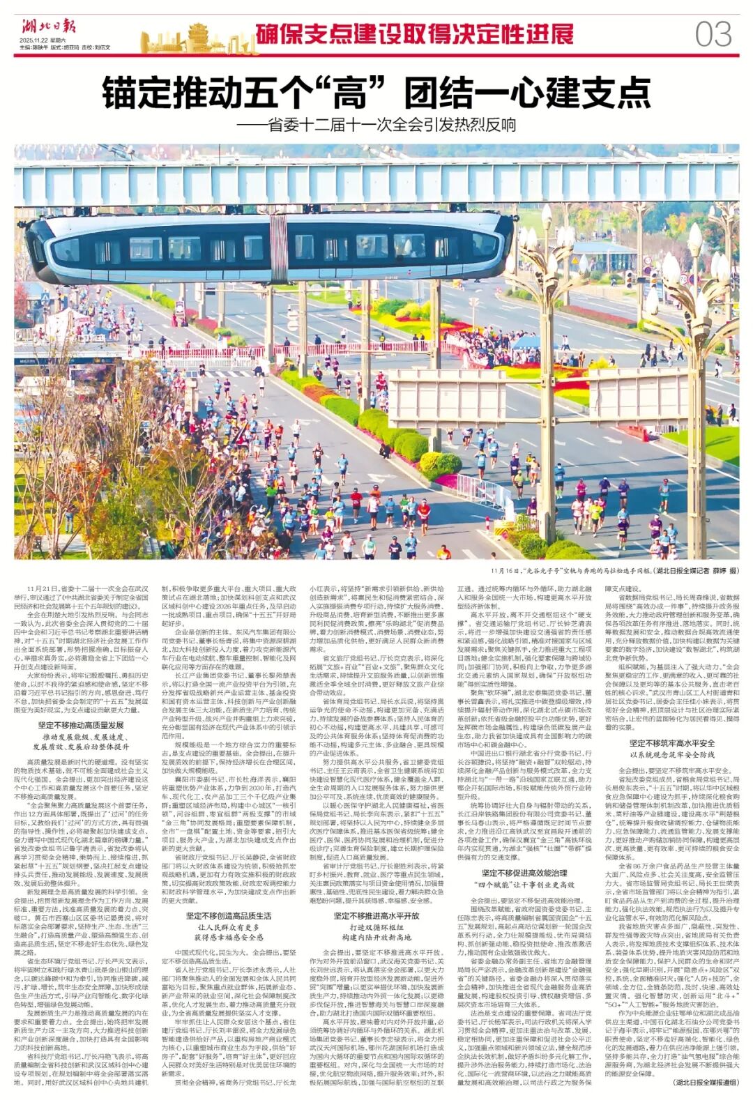 “全会聚焦聚力高质量发展这个首要任务,作出12方面具体部署,既提出了‘过河’的任务目标,又教给我们‘过河’的方式方法,具有很强的指导性、操作性,必将凝聚起加快建成支点、奋力谱写中国式现代化湖北篇章的磅礴力量。”省发改委党组书记鲁宇清表示,省发改委将认真学习贯彻全会精神,乘势而上、接续推进,抓紧起草“十五五”规划纲要,坚决扛起支点建设排头兵责任,推动发展能级、发展速度、发展质效、发展后劲整体提升。