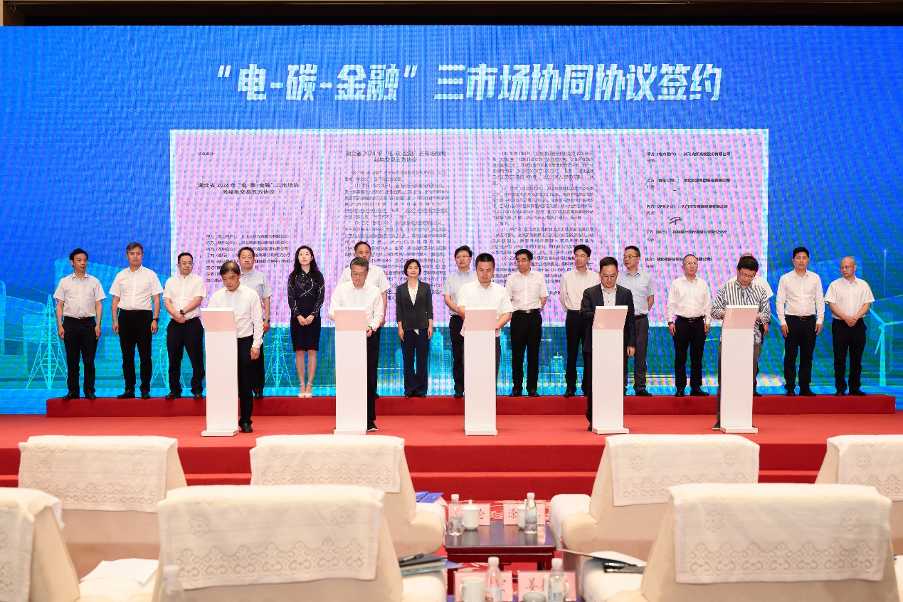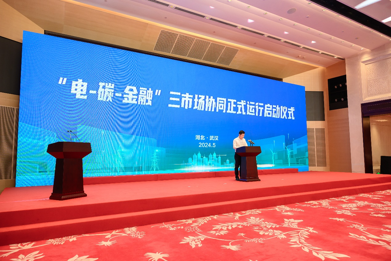 2024年5月31日,在“六五世界环境日”来临之际,湖北碳排放权交易中心与湖北电力交易中心、相关金融机构和市场主体共同举行湖北“电-碳-金融”三市场协同正式运行启动仪式,为探索以市场手段实现“双碳”目标、提升金融支持绿色低碳转型质效迈出坚实的一步。湖北省人民政府研究室二级巡视员文元伦、国网湖北省电力有限公司总会计师、党委委员涂海江、副总工程师李小平、国家能源局华中监管局市场监管处处长董小寒、湖北省能源局新能源处处长王晓峻、一级调研员易新文、湖北省生态环境厅气候处二级调研员马国柱、中国人民银行湖北省分行金融研究处副处长邓晓参加了此次启动仪式。