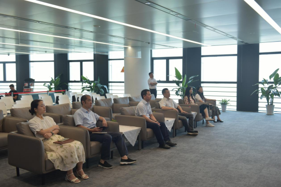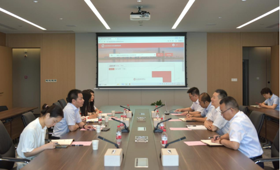 调研组一行在武汉股交党委副书记、总经理杨启蒙的陪同下,参观了中心交易大厅,听取了专精特新企业画像系统情况介绍。