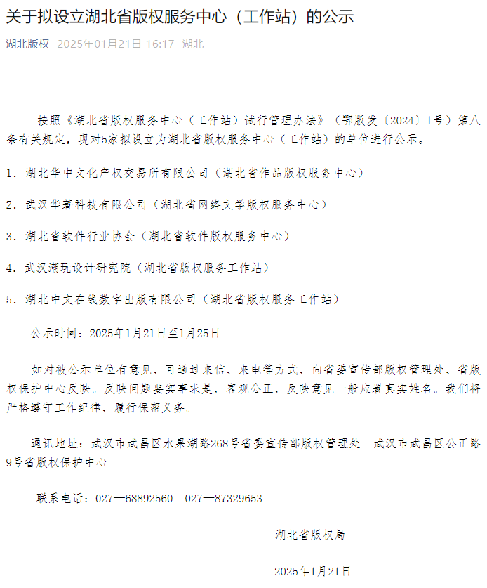 蛇年新春开工之际,华中文交所喜迎开门红!按照《湖北省版权服务中心(工作站)试行管理办法》有关规定,湖北省版权局对5家拟设立为湖北省版权服务中心(工作站)的单位公示期结束,华中文交所正式获批设立湖北省作品版权服务中心,标志着华中文交所在版权领域再迈新台阶。