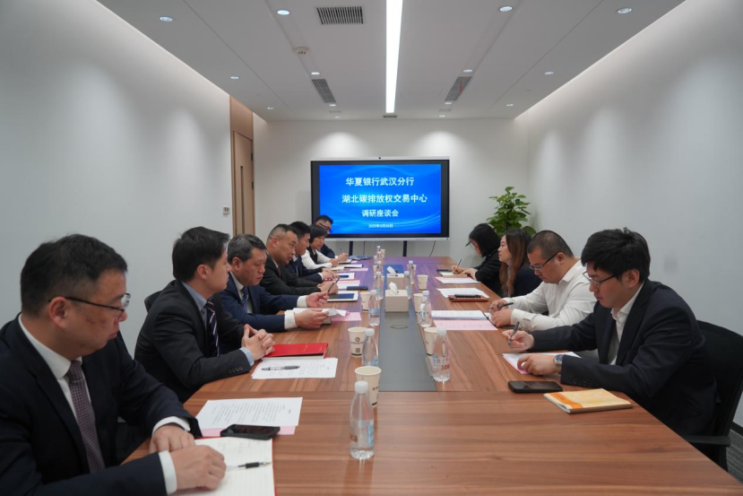 3月25日上午,华夏银行武汉分行总监兼公司业务部总经理汪俊一行到访湖北碳交中心开展业务调研,湖北碳交中心党委委员、副总经理张雁参加座谈交流。