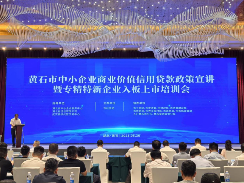 5月30日,黄石市中小企业商业价值信用贷款政策宣讲暨专精特新企业入板上市培训会成功举办。黄石市副市长郭宝出席活动并致辞。170多名省内商业银行和黄石本地优质企业代表参加活动。