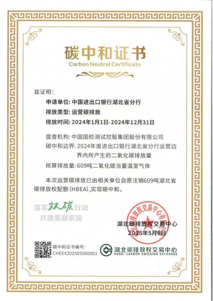 进出口银行湖北省分行通过节能技改实现了自身碳排放量的大幅降低,同时,通过注销609吨湖北碳配额(HBEA)成功抵消了2024年度经营活动产生的碳排放量。