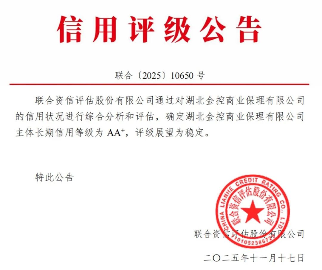 11月17日,经专业信用评级机构联合资信评估股份有限公司评定,湖北金控商业保理有限公司(简称“宏泰保理”)成功获评“AA+”主体长期信用等级,评级展望为“稳定”,是湖北省首家获得“AA+”信用等级的商业保理公司。