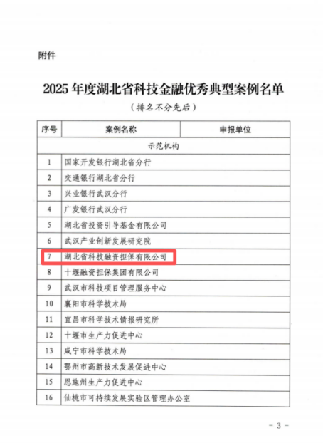 近日,省科技厅、省财政厅、省地方金融管理局、人民银行湖北省分行、湖北金融监管局、省证监局联合发布《2025年度湖北省科技金融优秀典型案例》,省再担保集团斩获两项殊荣——公司科技创新担保计划获评特色产品,旗下省科担公司获评示范机构。