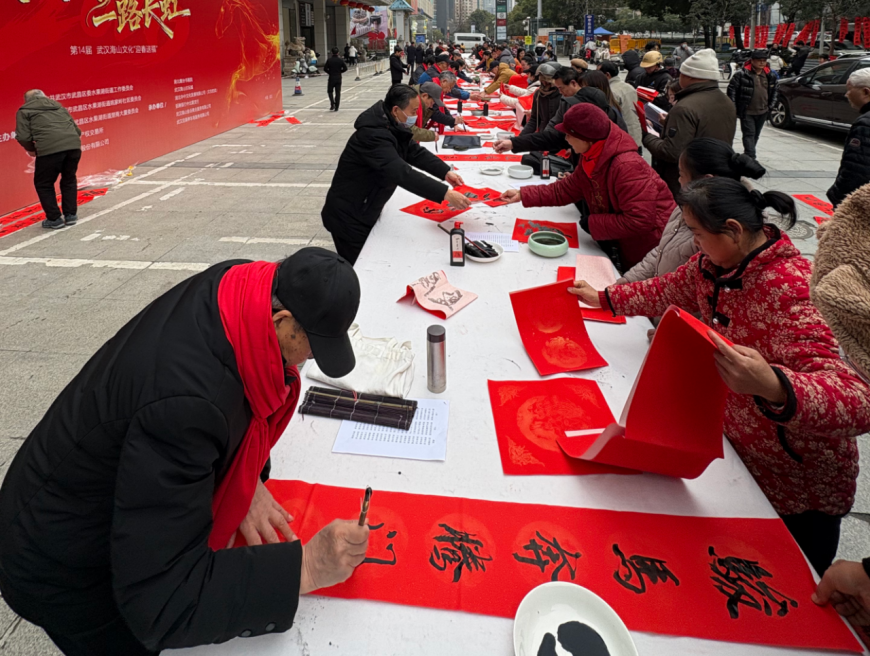 本次活动分为两个部分。1月31日下午,由华中文交所联合武昌区水果湖街道党工委、武昌区水果湖街道姚家岭社区委员会、武昌区水果湖街道楚商大厦委员会、湖北鹰台书画院、武汉海山文化、招商银行中北路支行等单位主办的“马到成功·一路长虹”——迎春纳福送吉祥活动如期举行。40位荆楚知名书法家挥毫泼墨、笔走龙蛇,将新春的喜庆祥和与传统书法的典雅韵味完美交融,将一幅幅充满吉祥寓意的春联“送到”市民手中。本次活动是华中文交所“2026艺术惠民暖民心”系列活动之一,后续还将通过艺术交流会、艺术跨界融合等方式推动荆楚艺术进一步走进千家万户。