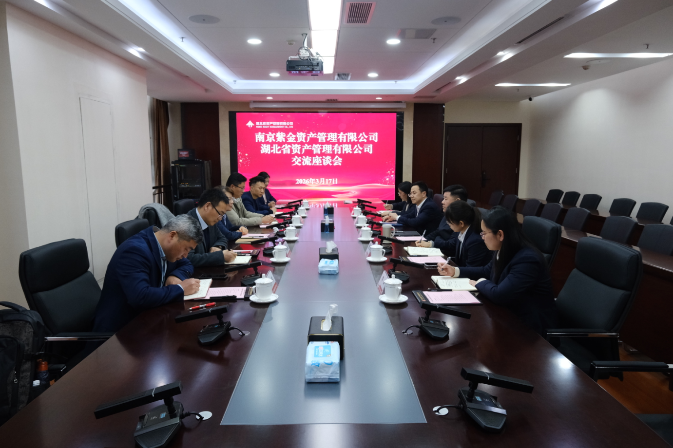 3月17日,湖北省资产管理有限公司党委书记、董事长李建军与南京紫金资产管理有限公司党支部书记、董事长王瑞一行座谈交流。双方就战略规划、风控合规、资产管理、绩效考核、人才梯队建设、投行化业务转型等方面展开深入会谈交流。