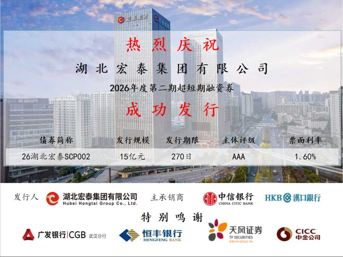 近日,集团成功发行2026年第二期超短期融资券,发行规模15亿元,票面利率1.60%,全场倍数2.65倍,期限270天。此次发行利率再次创下集团同期限债券历史最低水平,彰显了资本市场对集团综合实力与信用水平的高度认可。